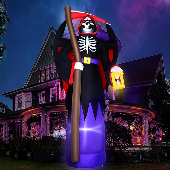 Make a bold statement with Rocinha’s 10-Foot Giant Halloween Inflatable Grim Reaper! This spooky inflatable features glowing LED lights, creating a haunting presence in your yard. Easy to set up with included stakes and tethers, it’s the perfect way to thrill trick-or-treaters and party guests alike.